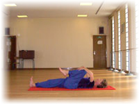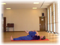 - Une jambe pliée, une jambe fléchie. Prendre appui sur le genou de la jambe fléchie, inspirer en remplissant l'espace thoracique, Expirer en relâchant la jambe. |