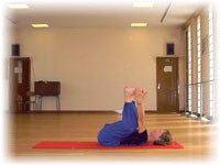 2 - Monter un pied au dessus de chaque épaule, tenir par le bord externe du pied, respirer en relâchant le bassin et les lombaires. |